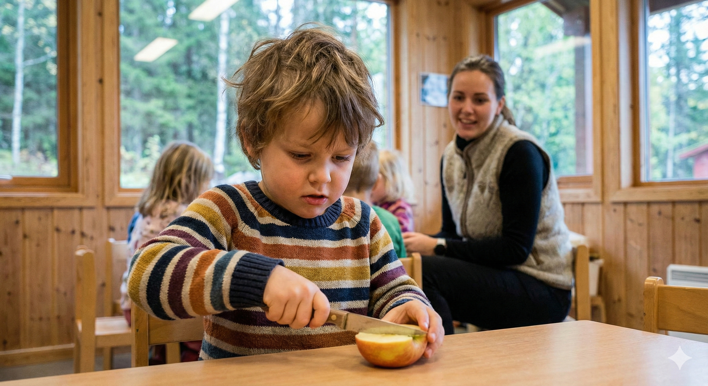 In Norwegian barnehage (Kindergarten), young children use real knives to cut fruit and whittle sticks. They learn to hold them properly and respect the tool. Small cuts happen, and they learn from them.
