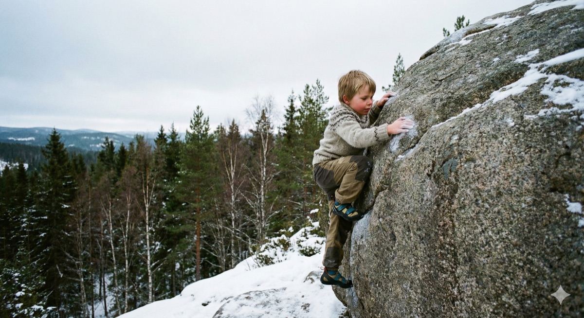 Norwegian children climb trees and rocks high, and adults don't hover underneath. Kids assess the risk themselves and learn their own limits.